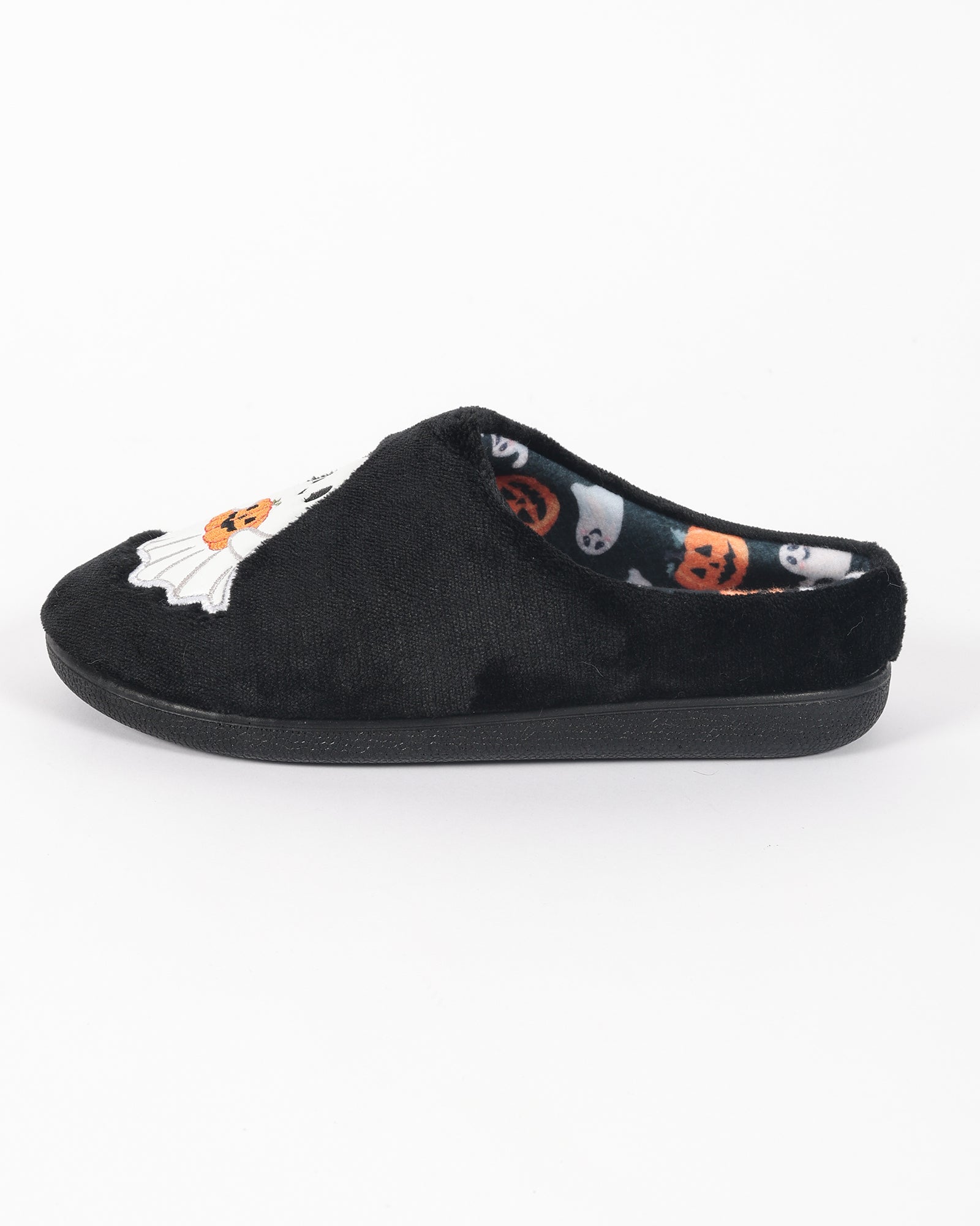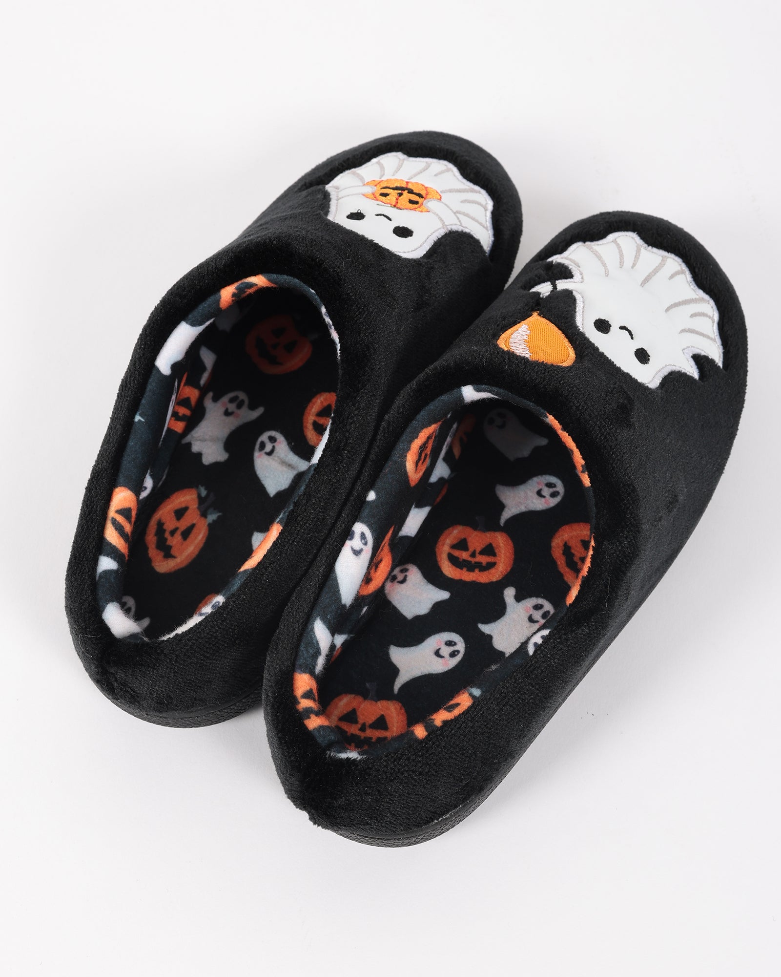 Soğuk kış günlerinde ayaklarınızı sıcacık tutacak bu siyah pelüş ev içi ayakkabı, sevimli hayalet ve balkabağı detaylarıyla Cadılar Bayramı ruhunu evinize taşıyor.