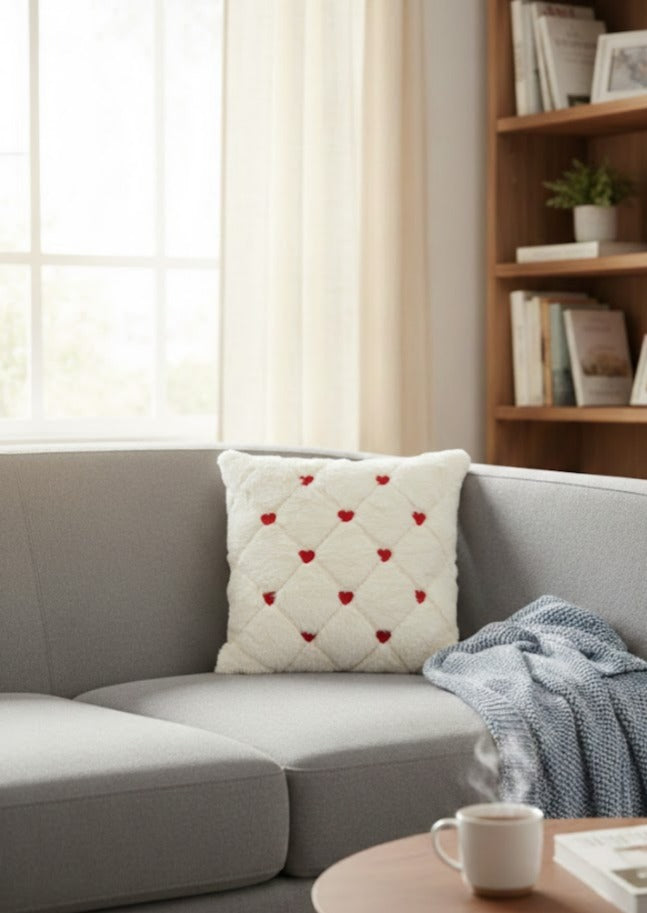Yaşam alanınıza modern ve sıcak bir dokunuş ekleyin. En popüler dekorasyon trendlerinden olan teddy kumaşın eşsiz dokusu, canlı kırmızı kalp figürüyle buluşuyor. Hem şık hem de romantik bir atmosfer yaratmak isteyenler için ideal bir tercih.